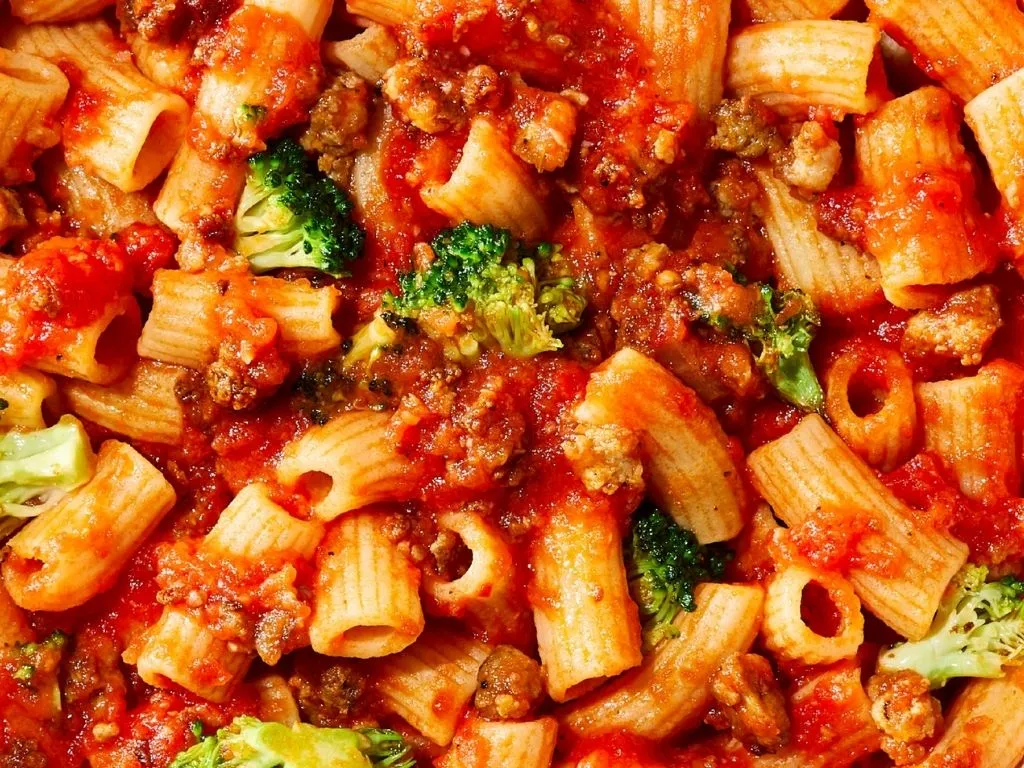 Sausage crumble, broccoli, tomato sauce, and homemade chili oil