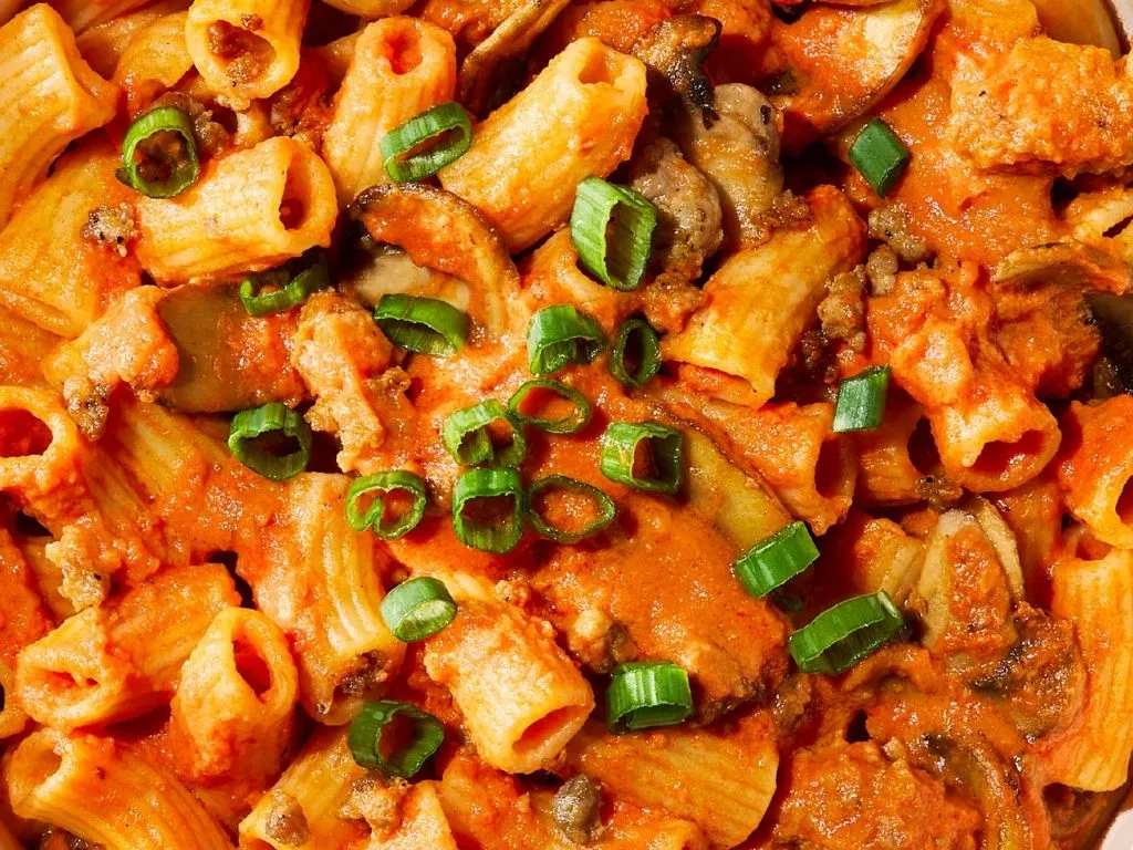 Crumbled sausage, sautéed mushrooms, rosé sauce & green onions
