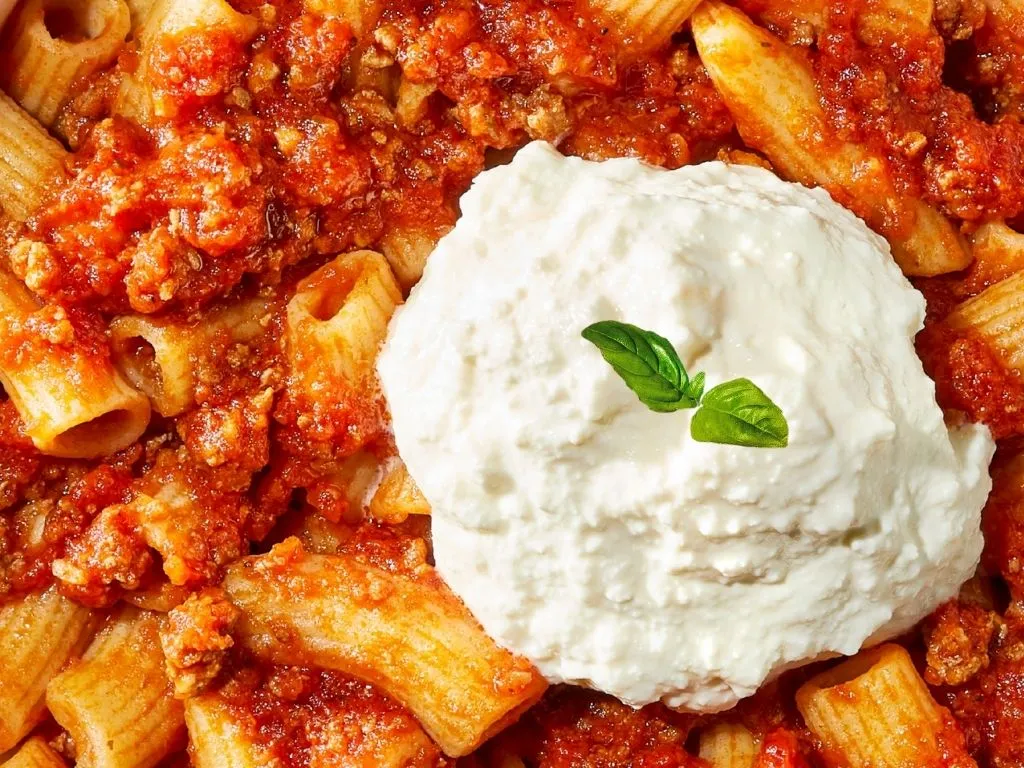Homemade bolognese sauce topped with fresh ricotta cheese